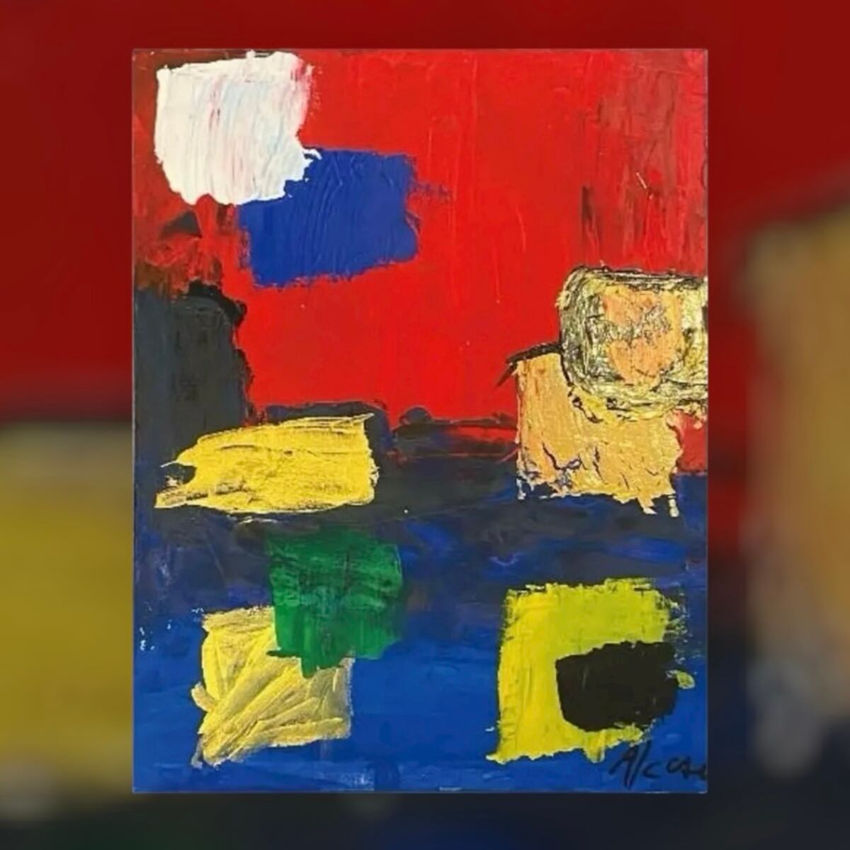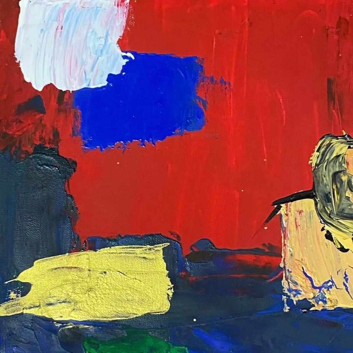赤と青の広がりの中に、積み重なるようなかたちを置いて、