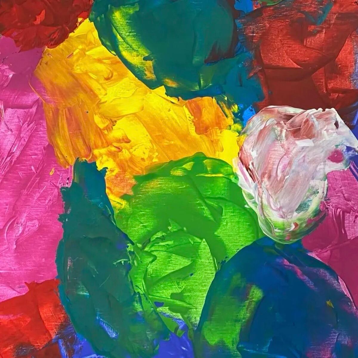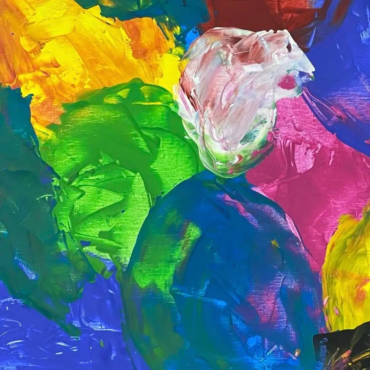大きなキャンバスいっぱいに広がる色と色――重なり合い、まざり合い、とけあうように描かれたカラフルな世界。そのひとつひとつが「やさしい心」のかたち。あたたかさ、ぬくもり、素直さ、そして思いやり。目には見えない“心”が、ここではちゃんと色になって存在しています。
