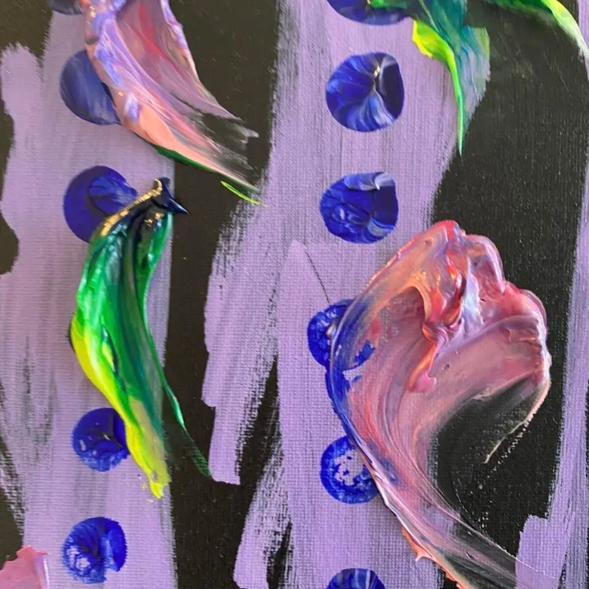 黒い背景の上を勢いよく流れるような紫のライン。その上に重なる、緑とピンクの波のような形。整った秩序はなく、しかしキャンバス全体には強い「動き」と「警告」のような緊張感が漂います。