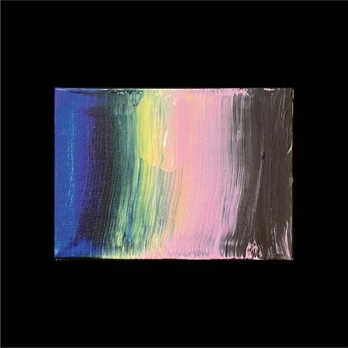 青、黄、ピンク、黒――さまざまな色が一つの方向へ流れるように伸びていくシンプルな抽象表現。しかし、この作品には作者AKASHIならではの“ことばの自由”が込められています。