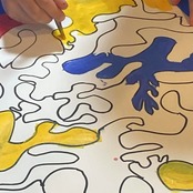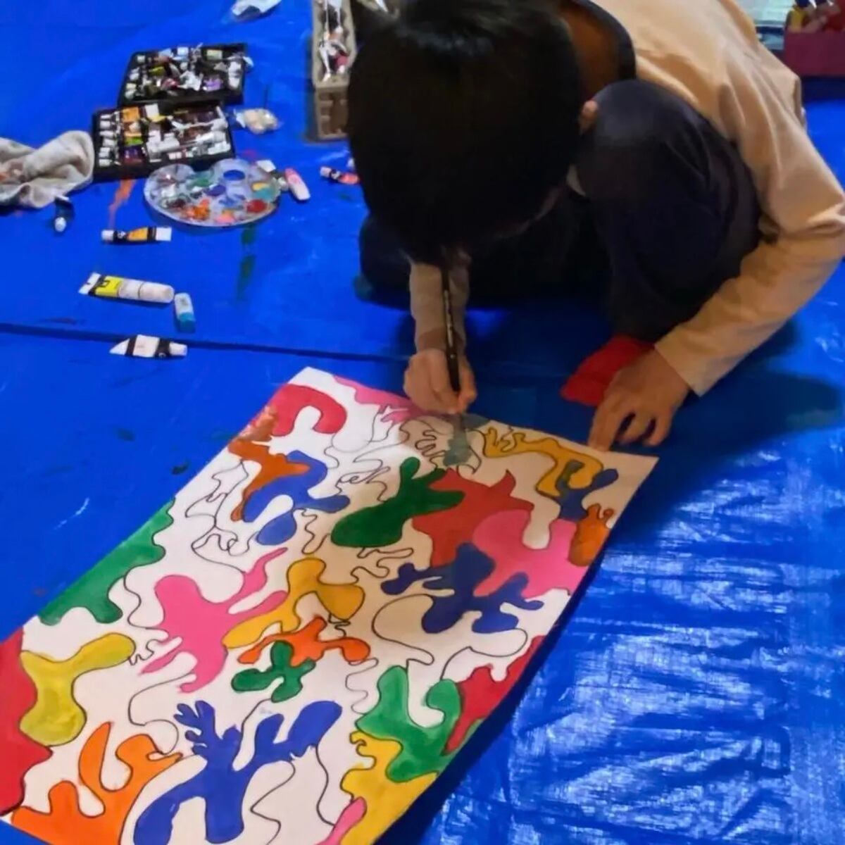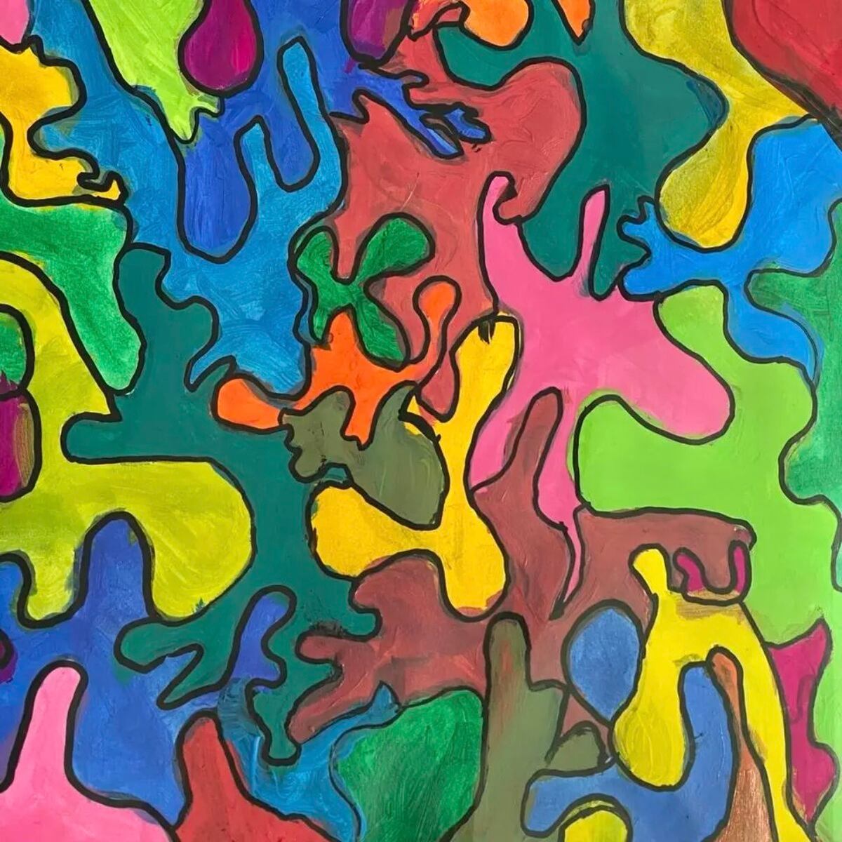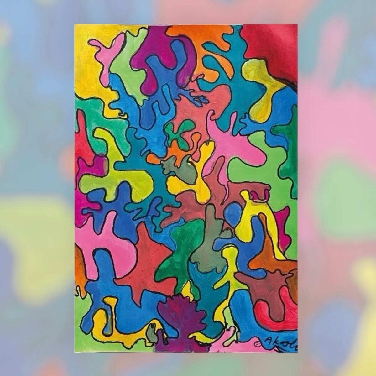 まるで、いろんな考えの人たちが共に生きる社会のよう。AKASHIは下書きをせず、思いついた形を自由に描きながら完成させました。優しい色合いと生き生きとした線が印象的な作品です。
