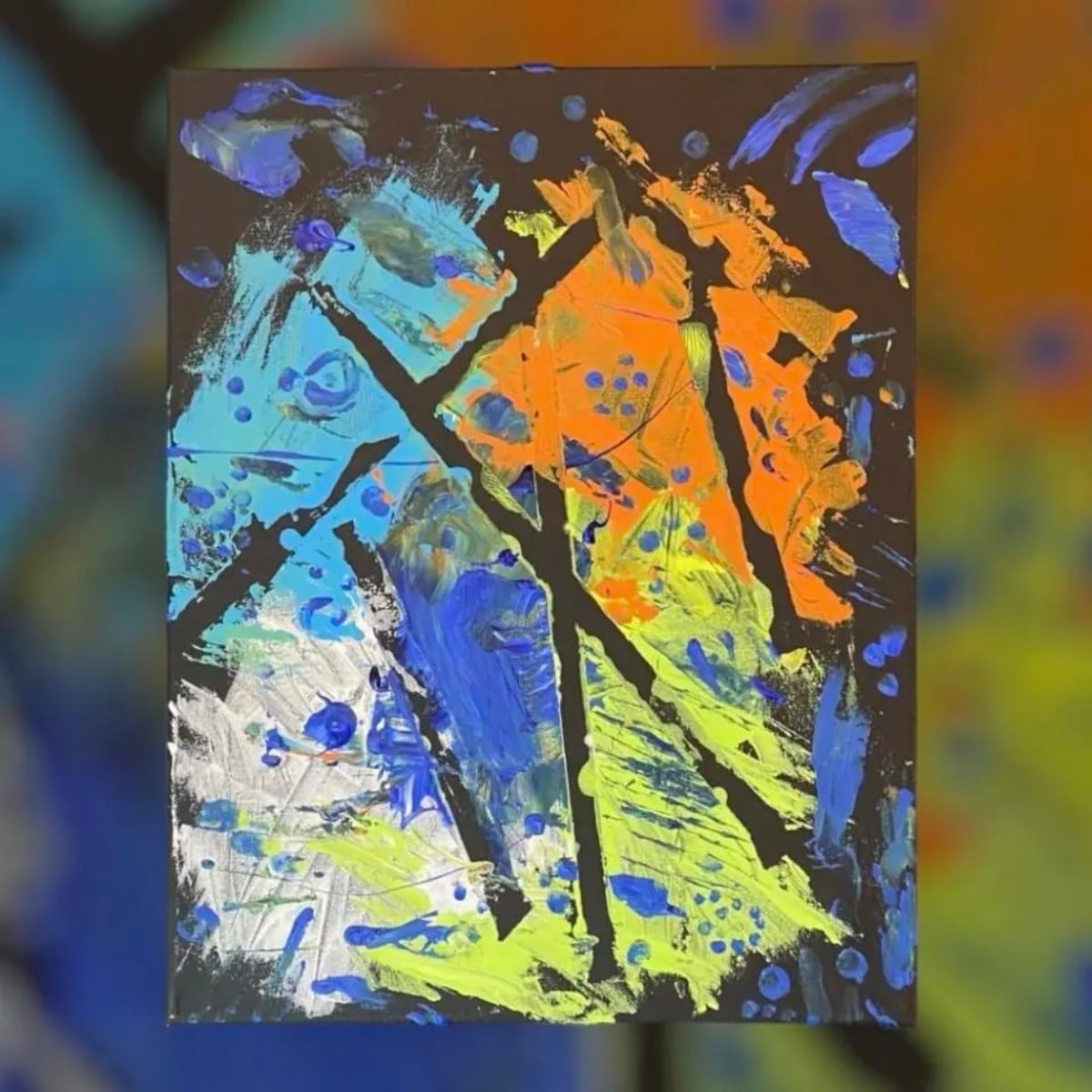 黒いキャンバスの上に、青・オレンジ・黄緑・白が勢いよくぶつかり合うように広がった作品。