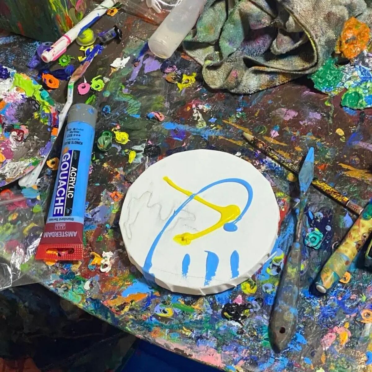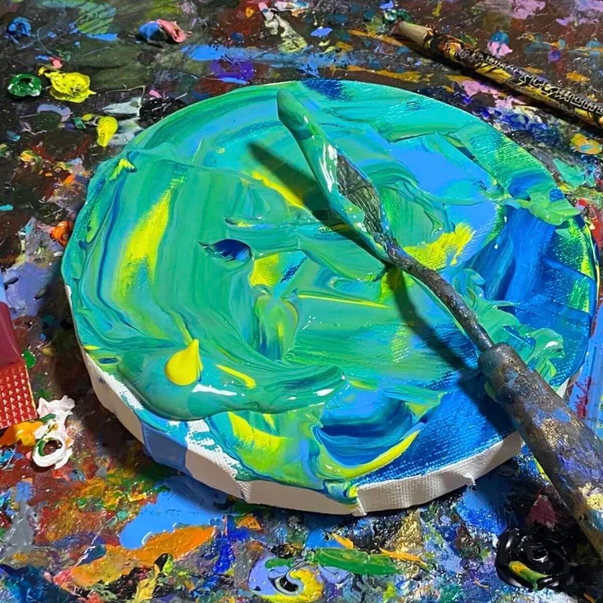 丸いキャンバスに、メディウムをたっぷり使って立体的に仕上げた作品です