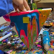 流れるような絵の具のラインは、バルセロナの空の色や光を思わせ、鮮やかなピンクやグリーン、オレンジが重なり合ってまるで建築物が息づいているかのよう。