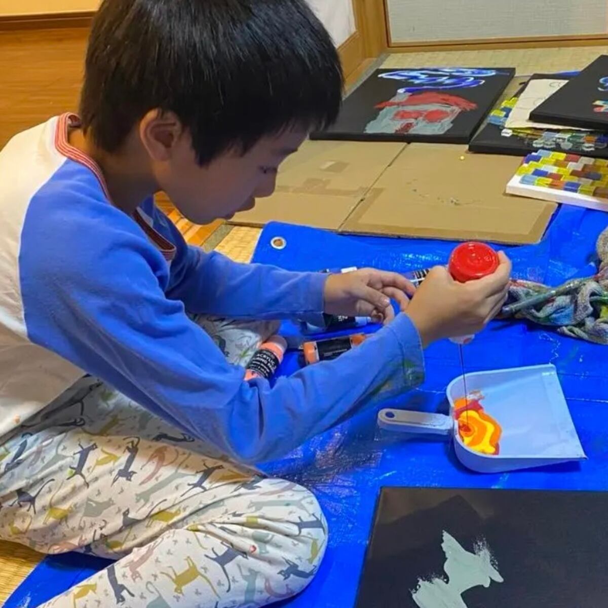 筆は使わず、ミニちりとりを使って絵の具を流す手法で制作。