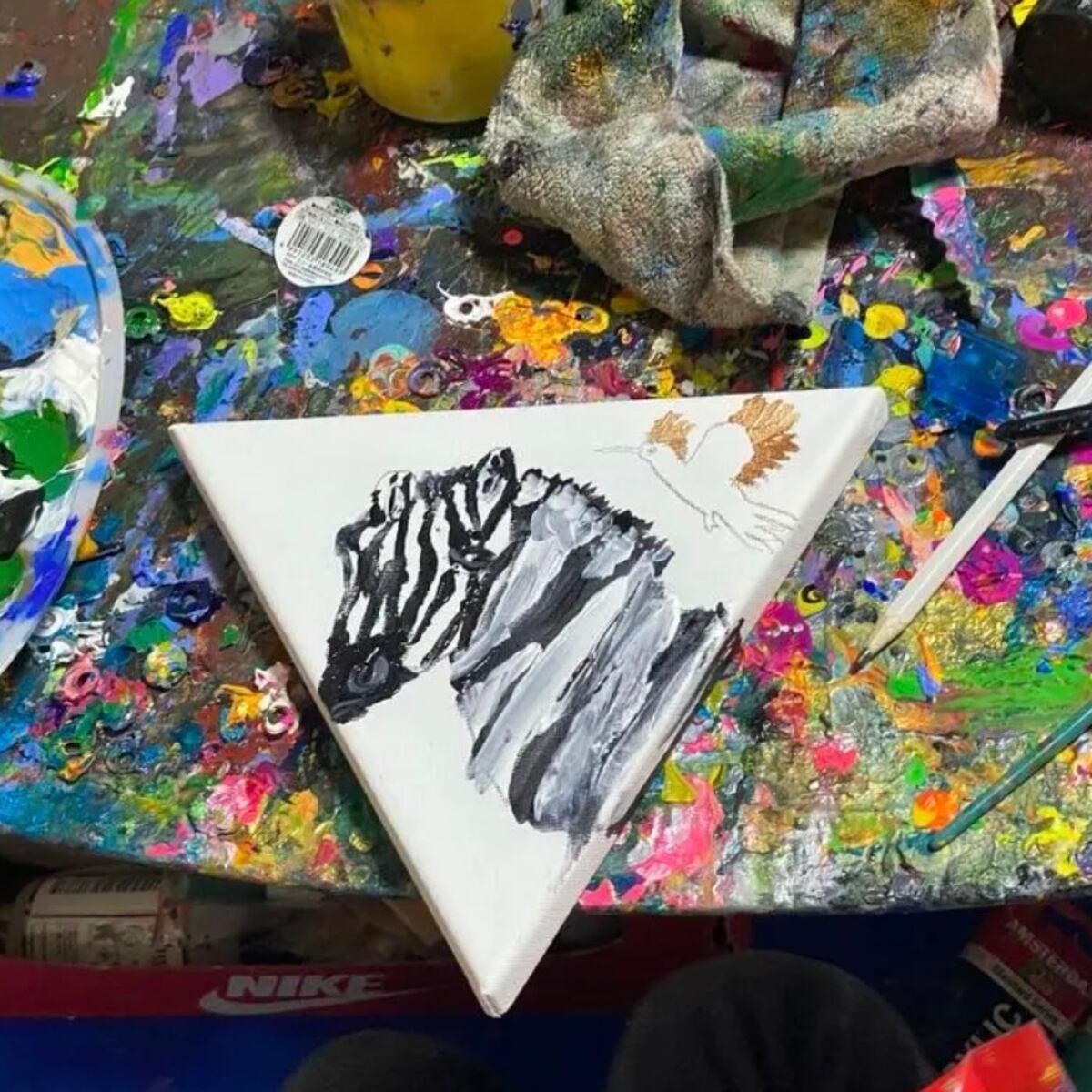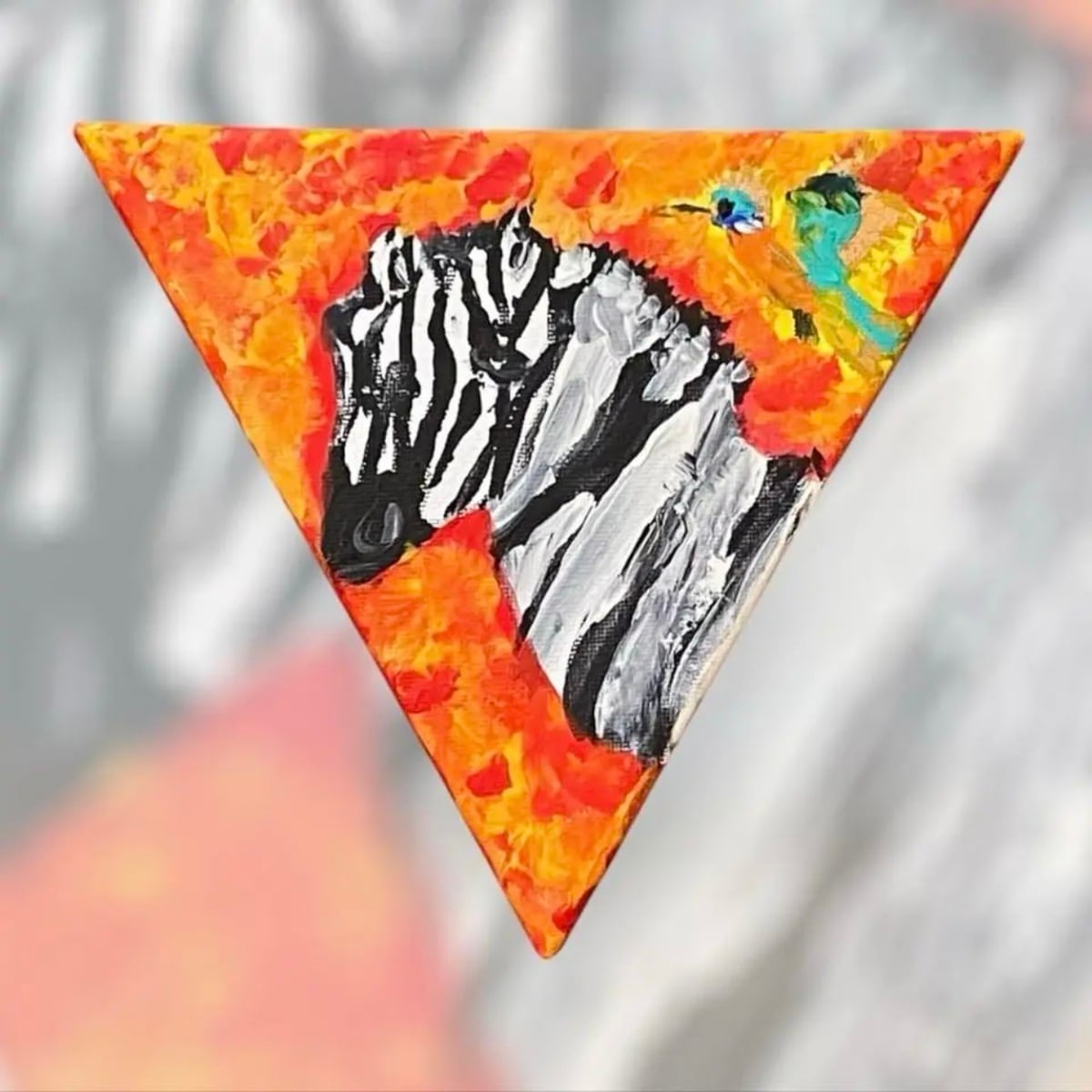 三角キャンバスの中に描かれた、力強いシマウマと小さなハチドリ。